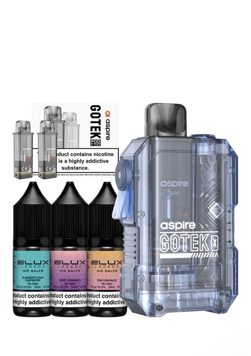 Make vaping super easy with the Gotek X Bundle. Choose your favourite colour, Pack of Pods and get 3 delicious flavours from the TABlites Premium Range or Elux Vape Juice.