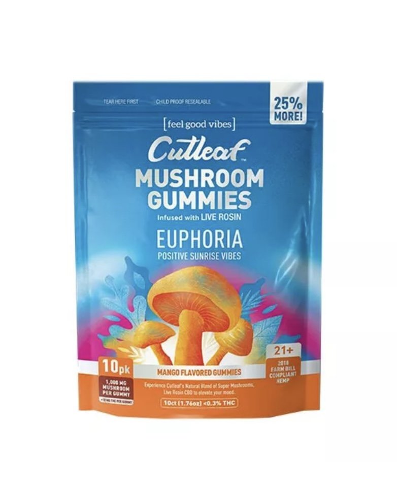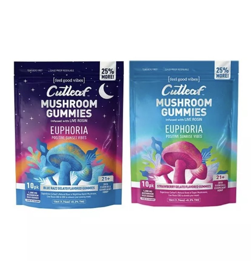 Cutleaf Euphoria Live Rosin Mushroom Gummies combine premium live rosin CBD with magic mushrooms for a uniquely uplifting experience.